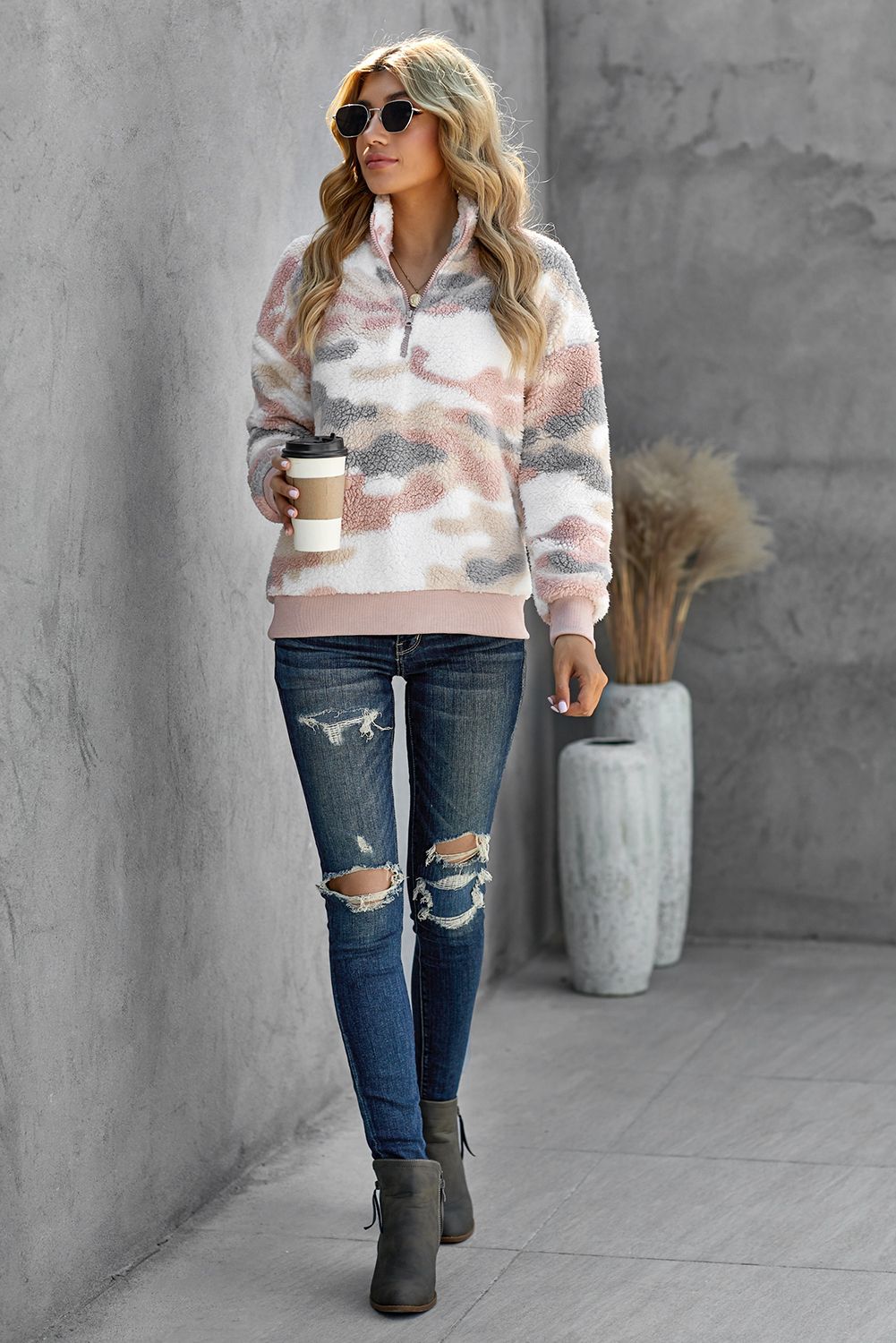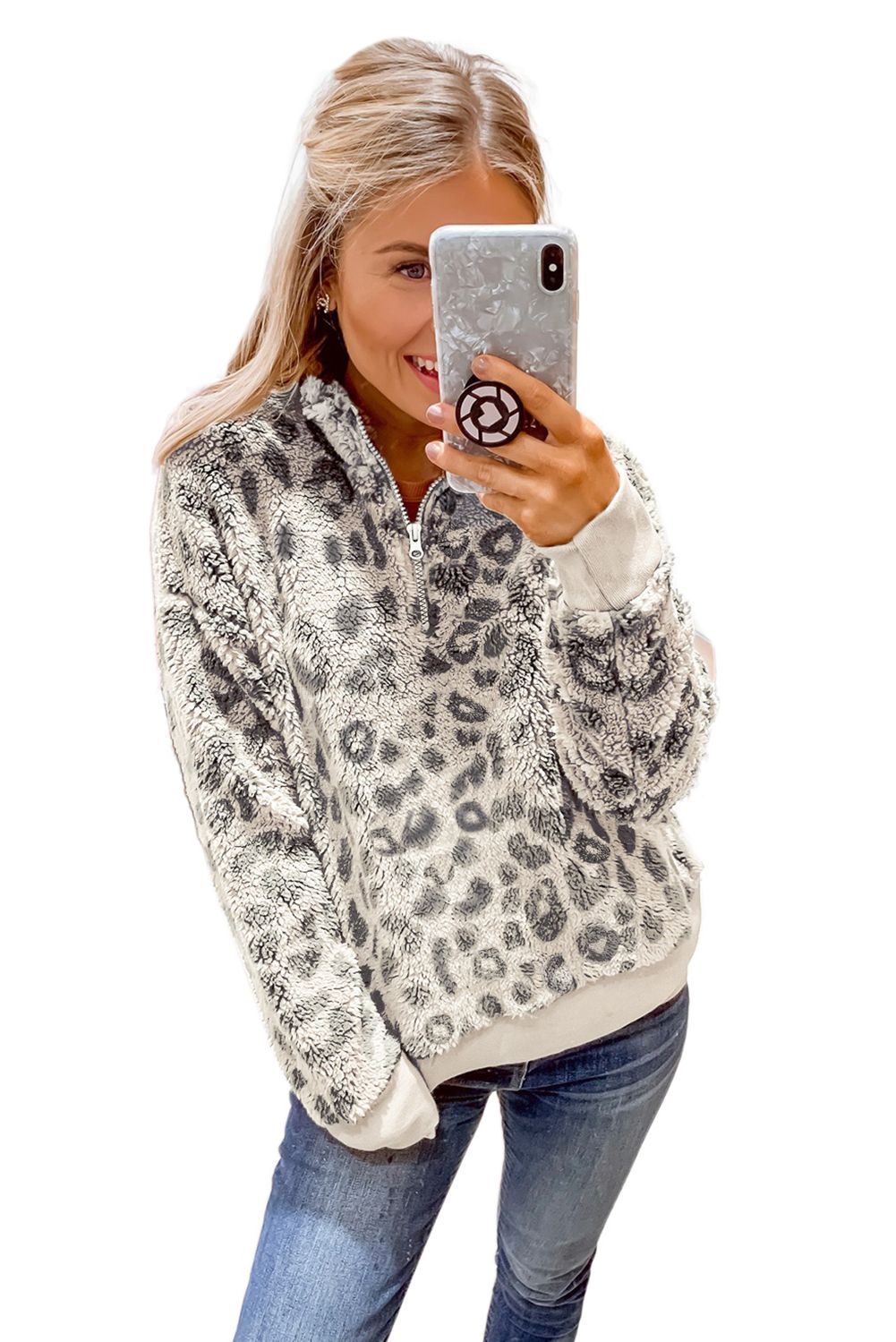 Leopard Print 1/4 Zip Elastic Cuff Sherpa Pullover