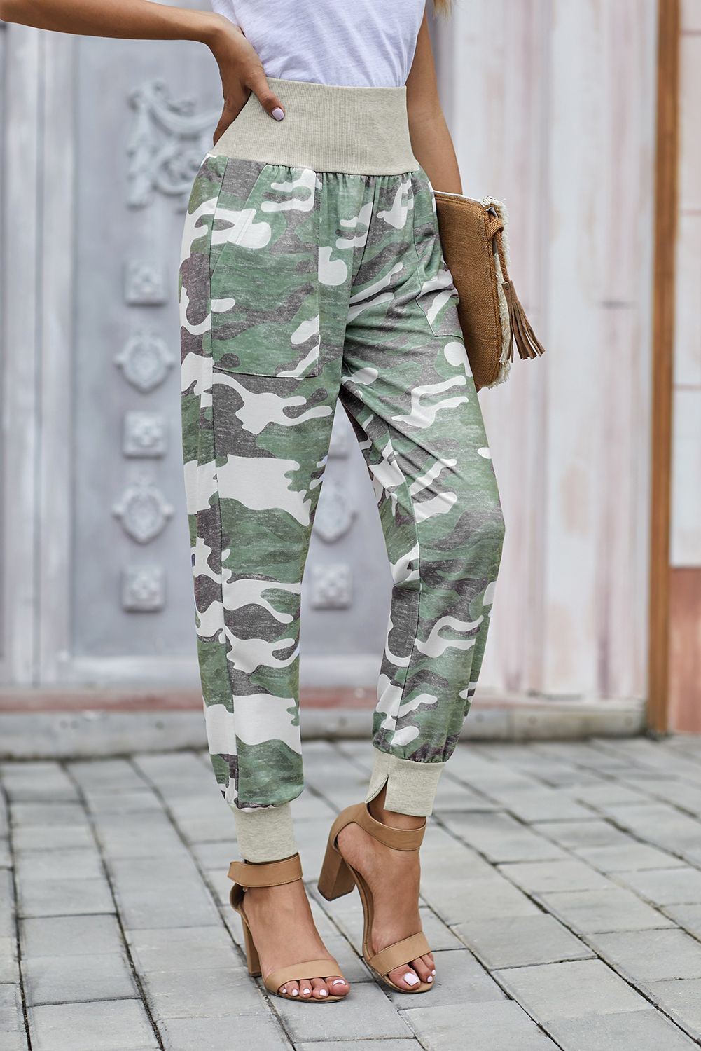 Light Green Camouflage Pocket Casual Pants With Slit