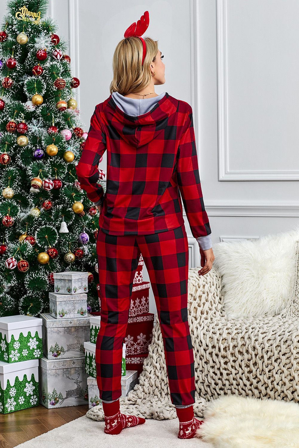 Christmas Plaid Leopard Print Pocket Hoodie and Slim-fit Pants Set