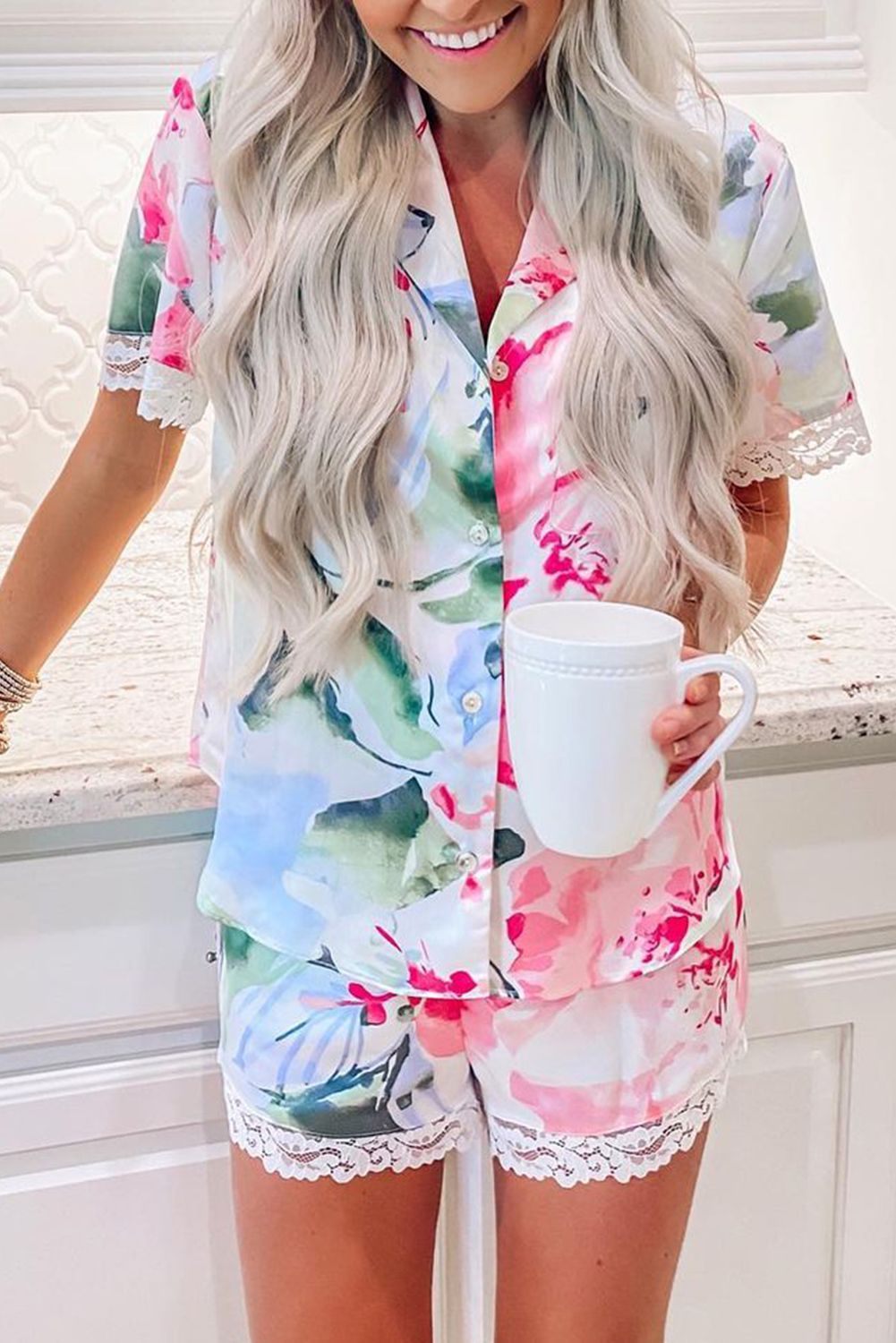 Multicolor Floral Print Lapel Button Shirt Shorts Pajamas Set
