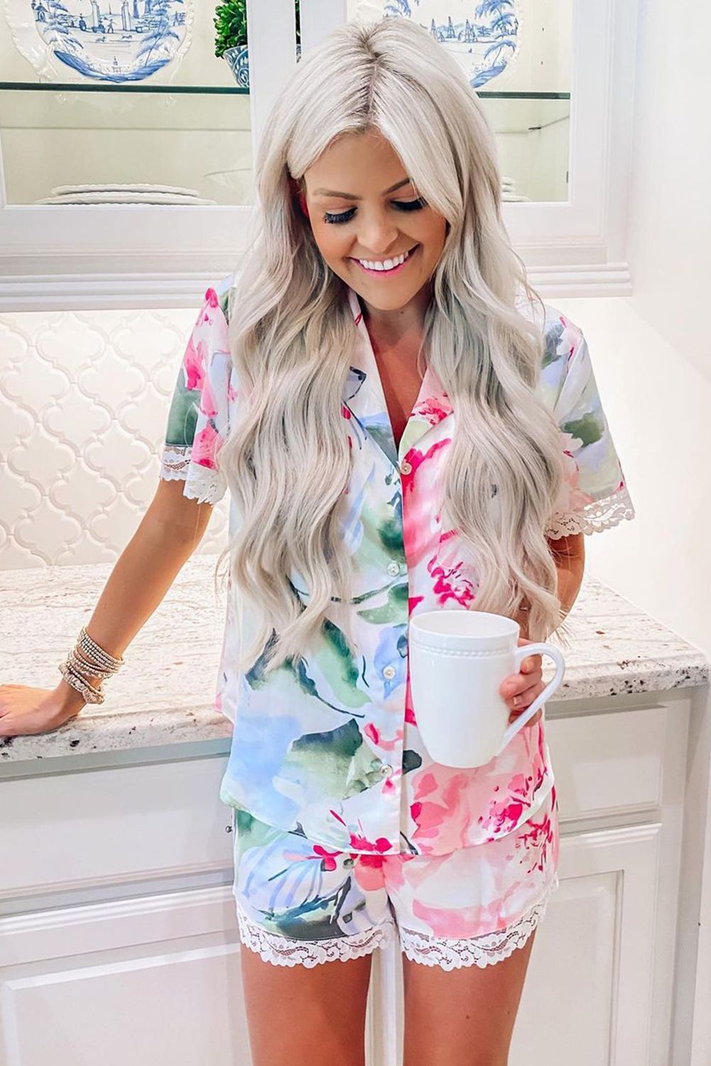 The lounge set with floral print and lace trim is delicate and lovely for girls and women