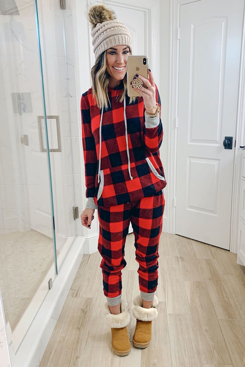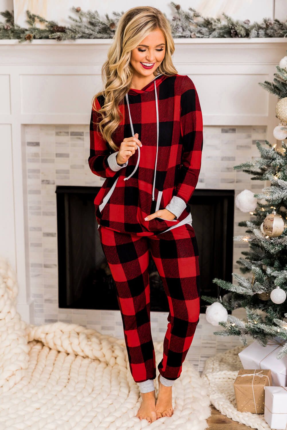 Red Plaid Pocket Drawstring Christmas Hooded Lounge Sets