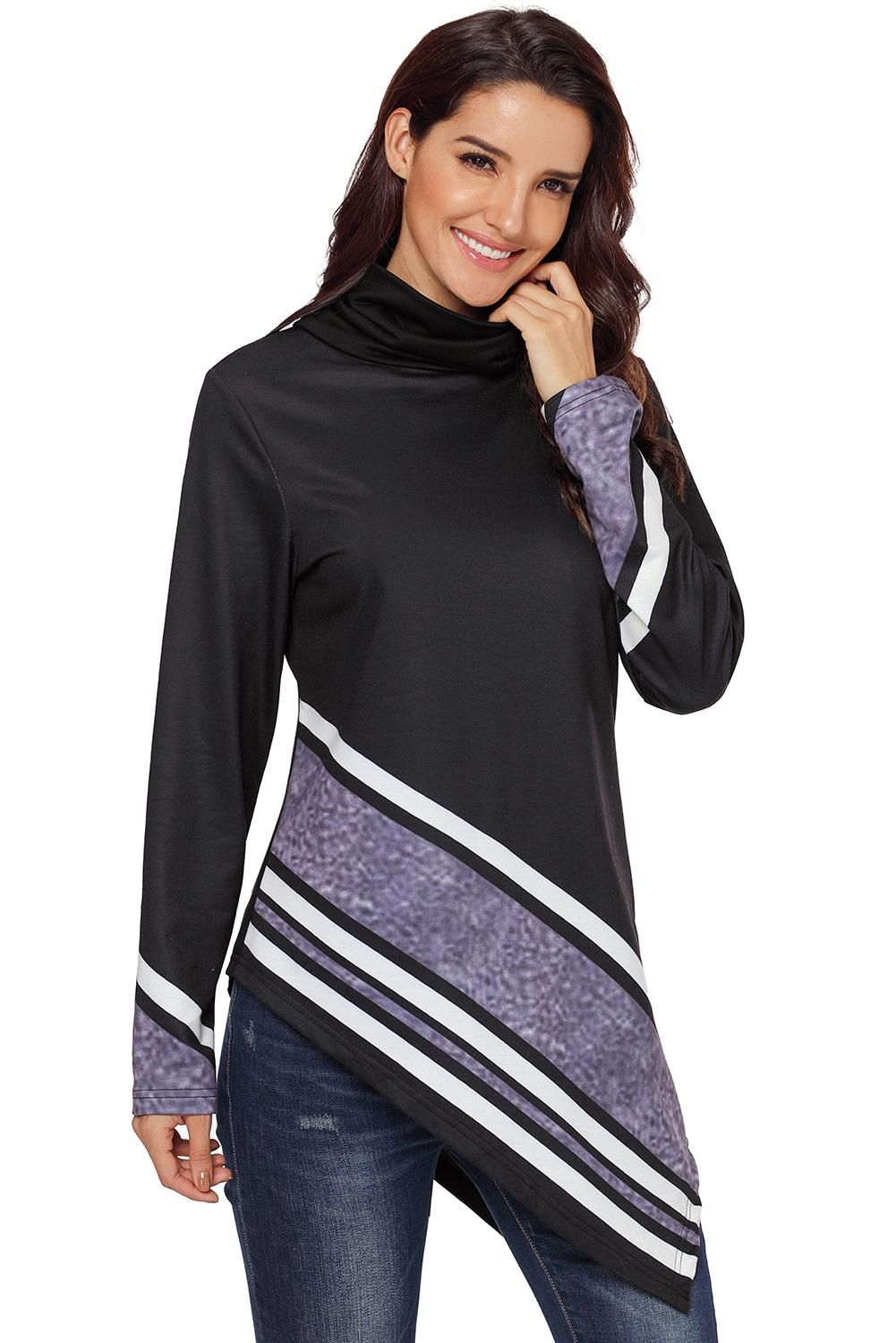 High neck, pullover sweatshirt for women Asymmetric hemline and printed pattern Long sleeves, longline silhouette in slim fit For day at the office or for a night out on the town Wholesale women's sweatshirts are wardrobe must haves Fine quality, affordable prices and stylish styles wholesale online Size Chart (CM)